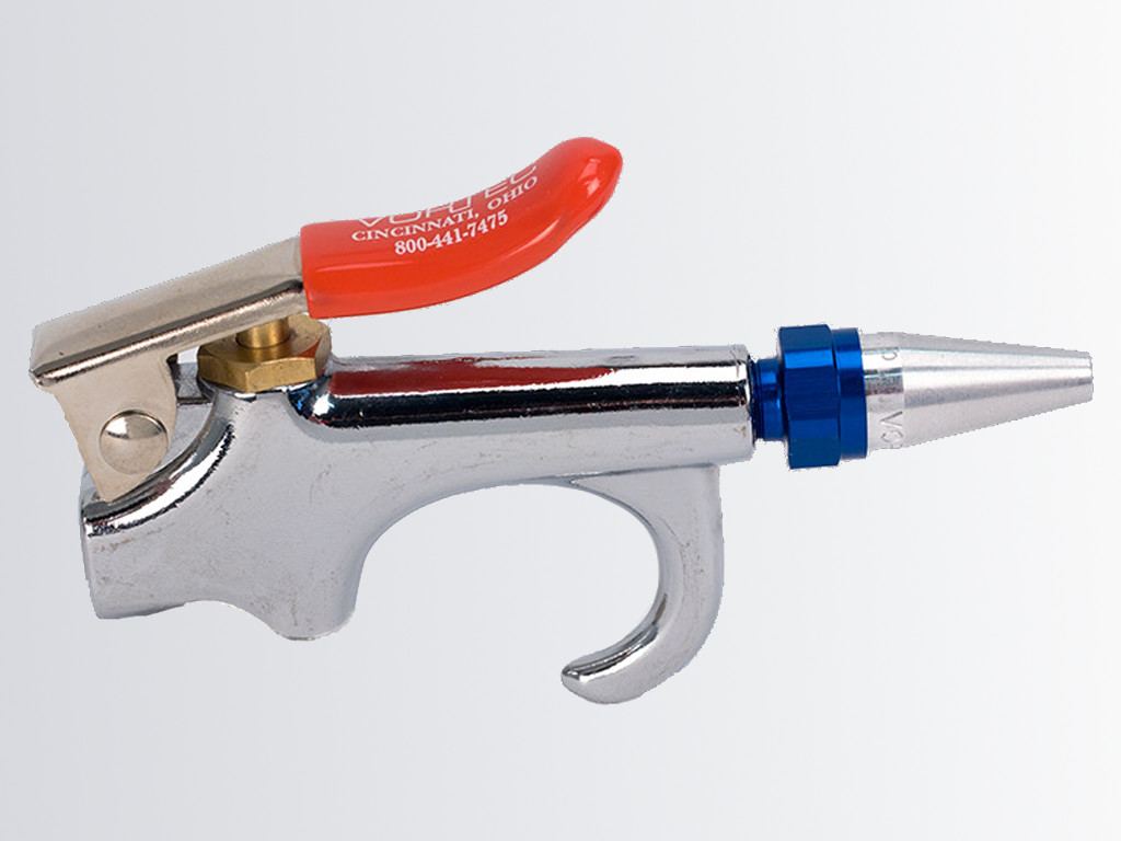 Die Handabblaspistole 9401BSP ist mit der druckluftsparenden und geräuscharmen Sicherheitsdüse 1200BSP ausgestattet. Sie wirkt als Luftstromverstärker (mitreißen von Umgebungsluft), die bei gleicher Abblaswirkung die benötigte Druckluftmenge um ca 50% reduziert und gleichzeitig den Geräuschpegel erheblich senkt. Sie wirkt gleichzeitig als Sicherheitsdüse um Emboliegefahr vorzubeugen, die durch das Eindringen von Druckluft in die Haut bei Verwendung von offenen Rohren besteht. Die Blaskraft der Düse ist durch drehen des Düsenkopfes mit Skala stufenlos einstellbar und durch arretieren der mittleren Konusschraube fixiert.