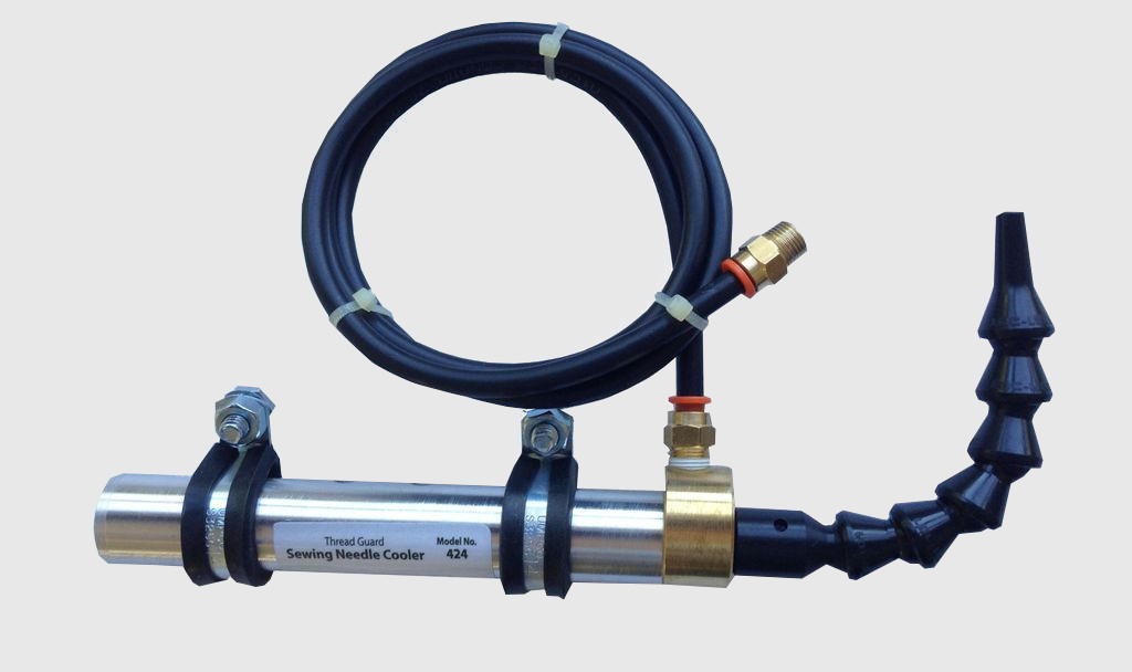 Mit dem Thread Guard® Nadel-Kühler, Modell 424J BSP von ITW Vortec, schießen Ihre Stückzahlen in die Höhe. Ausfallzeiten wegen Nadel- und Fadenbruch durch Überhitzung können mit diesem Nadelkühler nahezu vollständig ausgeschlossen werden. Er liefert einen ständigen Kaltluftstrom* an die Nähmaschinennadel. Die Nadel bleibt also kühl, auch bei anspruchsvollsten Näharbeiten, wie z.B. Gürtelschlaufen und bei zähem Material. Die Kühlung verhindert zugleich Lochbrand in synthetischen Geweben durch überhitzte Nadeln. Druckluftanschluss Modell 424 BSP: 113 l/min bei 6,9 bar.