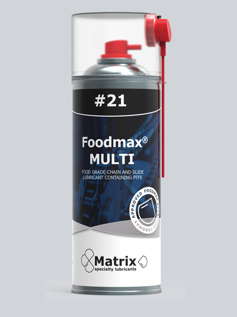 Foodmax® Multi Spray ist ein stark haftendes, weißes und lebensmittelverträgliches Schmiermittel aus der Sprühdose. Das Spray umfasst eine Kombination aus einem lebensmittelverträglichen, synthetischen Schmierfluid mit 4 % lebensmittelverträglichem Feststoffschmiermittel (PTFE). Für die Schmierung von Ketten, Förderanlagen, Gleitführungen, Verbindungsstellen, Formführungen, kleinen Wälzlagern und allen Anwendungen, die ein lebensmittelverträgliches Hochleistungs-Schmiermittel erfordern.