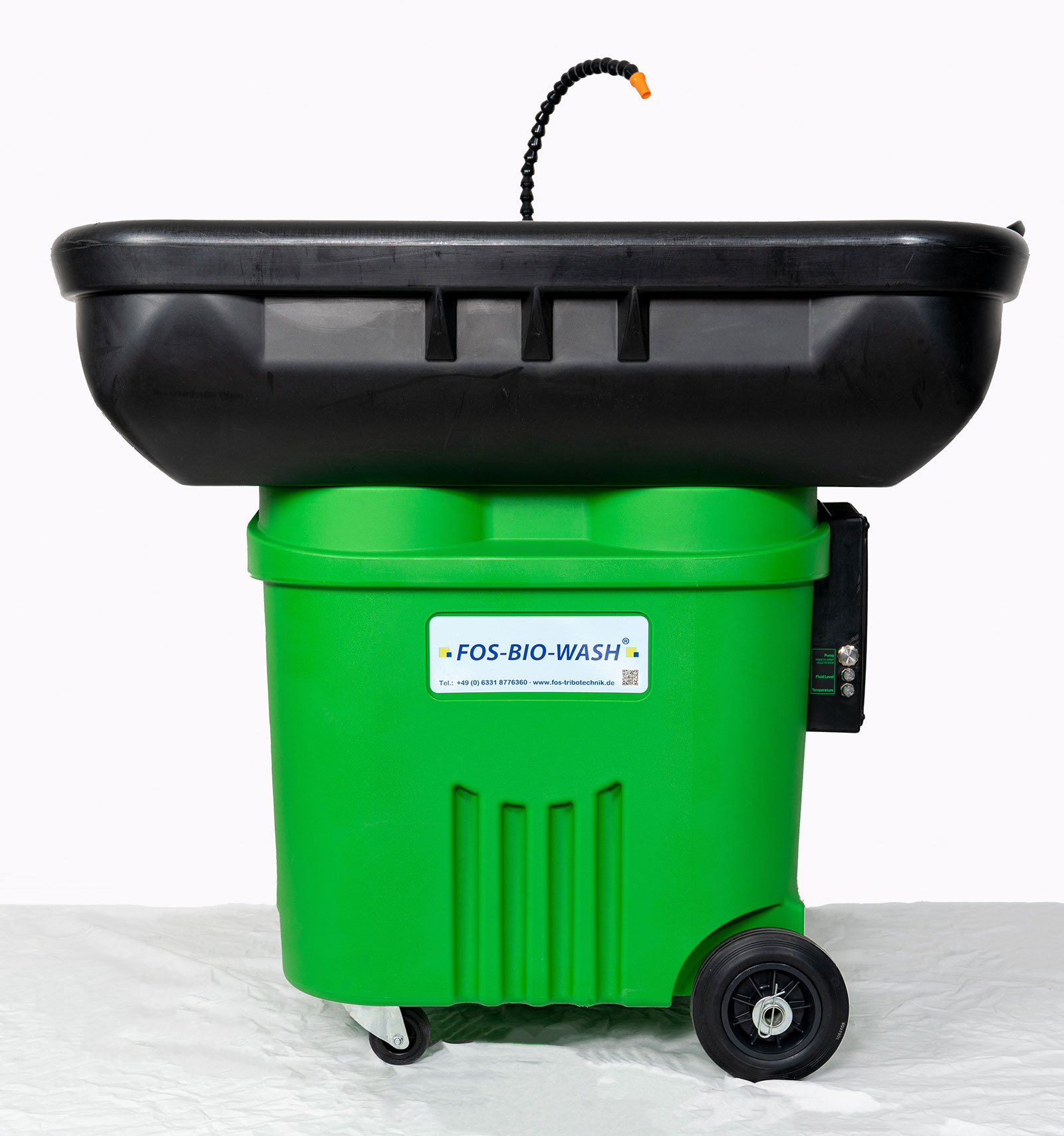 Robuster fahrbarer Teilereiniger mit großem Waschplatz geeignet für 2 Arbeitsplätze. Große Werkstücke können problemlos und effizient gereinigt werden. Die Filtrierung und der Eintrag der Mikroorganismen erfolgt über den innen einzulegenden FOS-BIO-WASH® FILTER. Die Belastbarkeit der Spüle liegt bei 200 kg. Der Flüssigkeitsbehälter hat eine Kapazität von 60 Liter FOS-BIO FLUID®. Nach 4 Stunden Inaktivität schaltet der Premium MobilR automatisch in den Energiesparmodus (37°C) und bleibt auf dieser Temperatur, bis die Pumpe erneut gestartet wird um wieder auf 42°C aufzuheizen.