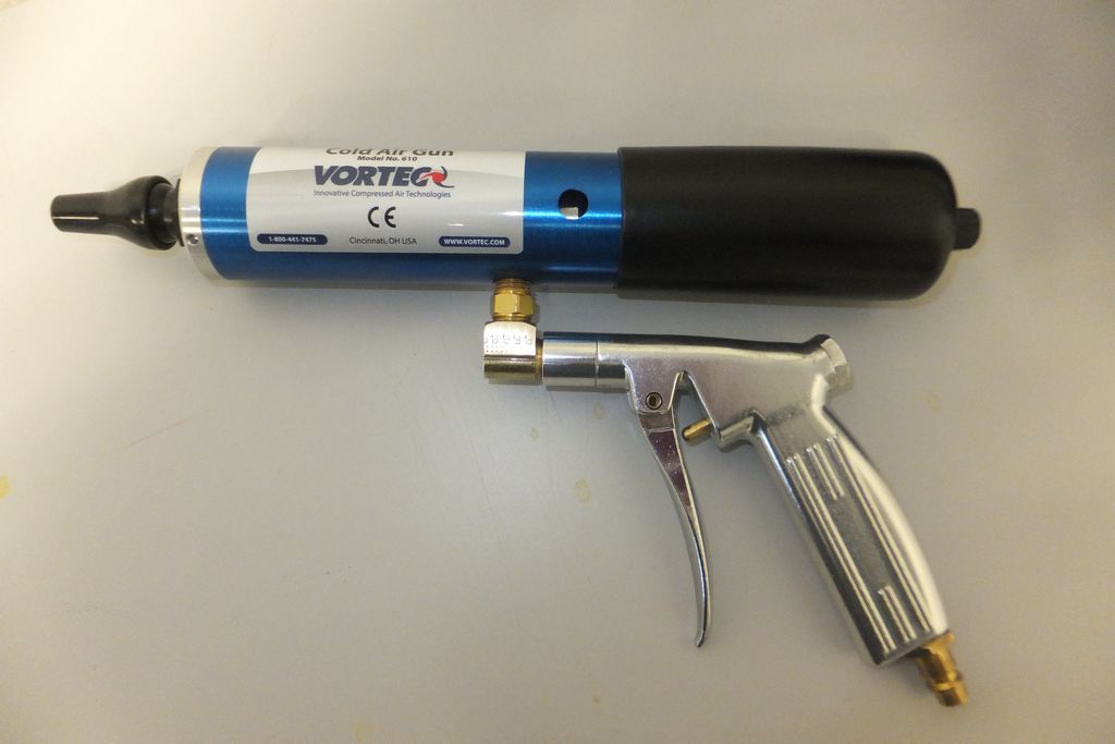 Die Kaltluftpistole 616 für Handbetrieb, ist ideal für den Einsatz bei Kühlung von Werkstücken, bei industriellen Prozessen und in Werkstätten. Sie ersetzt teure und umweltschädliche Kältesprays, ist ergonomisch und mobil. Sie wird mit normaler Werksdruckluft von 2 bis 10 Bar betrieben. Anwendungen sind zum Beispiel bei Montage von Kugellagern auf Wellen. Der maximale Temperaturabfall beträgt 55°C unter die Einlasslufttemperatur. Die Kaltluftpistole hat eine Leistung von 264 Watt (bei 6,9 Bar).