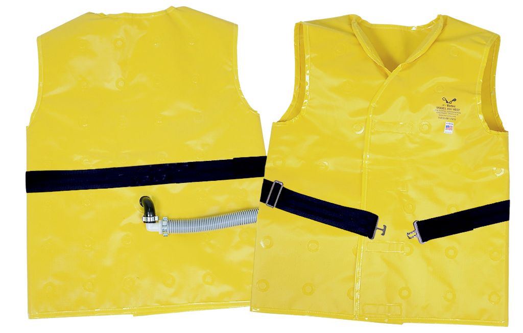 Die Streuluftweste, Art.-Nr: COOLINGVEST-L-BSP, COOLINGVEST-XL-BSP oder COOLINGVEST-2XL-BSP, wird durch einen kalten Luftstrom gespeist, welcher durch einen Vortec Personenklimatisierer oder Personenkühler erzeugt wird. Sie verteilt über hunderte kleiner Löcher die eingeführte Luft über den Oberkörper, wo sie am meisten gebraucht wird. Eine besondere Klettenkragenausführung gestattet es, dass die Luft bei Bedarf über Gesicht und Kopfbereich abgelenkt wird.