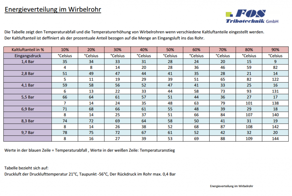 Diese Tabelle zeigt Ihnen die Kühlleistungen in kcal/Stunde, den Druckluftverbrauch in Normliter pro Minute und den Temperaturabfall bezogen auf die Temperatur der Eingangsdruckluft.