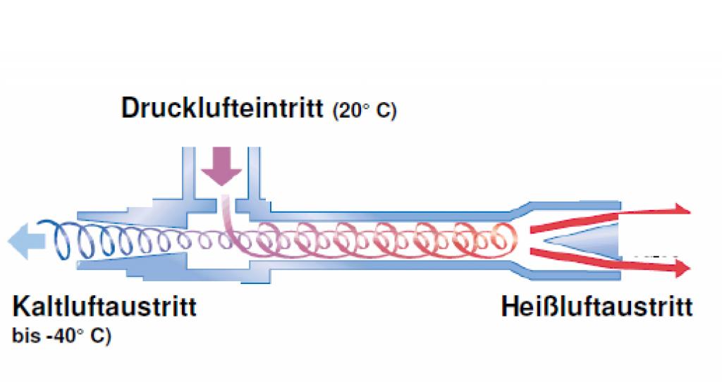 Das Wirbelrohr wurde 1930 von dem französischen Physiker Georges Ranque entdeckt. Vortec entwickelte auf der Basis des Wirbelrohrprinzips praxisreife, wirksame Kühlungsanwendungen für Industrie und Technik. Flüssigkeit, die sich um eine Achse dreht - wie ein Tornado - wird als "Wirbel" bezeichnet. Ein Wirbelrohr erzeugt einen Wirbel aus Druckluft und trennt ihn in zwei Ströme: Einen Heiß- und einen Kaltluftstrom. Die Druckluft tritt in einen zylindrischen Generator ein, der proportional größer ist als das (lange) heiße Rohr, wo sie die dort befindliche Luft in Drehung versetzt. Danach wird die kreisende Luft an der Innenwandung des heißen Rohrs entlang gepresst, wo sie Geschwindigkeiten von 1 000 000 U/min erreicht. Am Ende des heißen Rohrs entweicht ein kleiner Teil der Luft durch ein Nadelventil am Heißluftaustritt. Die übrige Luft wird zwangsweise mit niedrigerer Geschwindigkeit durch die Mitte des eintretenden Luftstroms zurückgeführt. Die Wärme in der langsamer strömenden Luft wird an die schneller strömende eintretende Luft abgegeben. Die unterkühlte Luft strömt durch die Mitte des Generators zum Kaltluftaustritt.