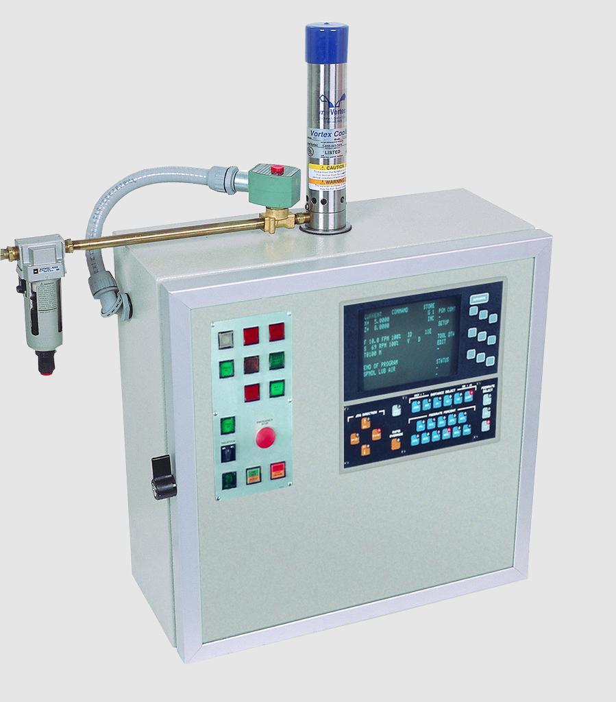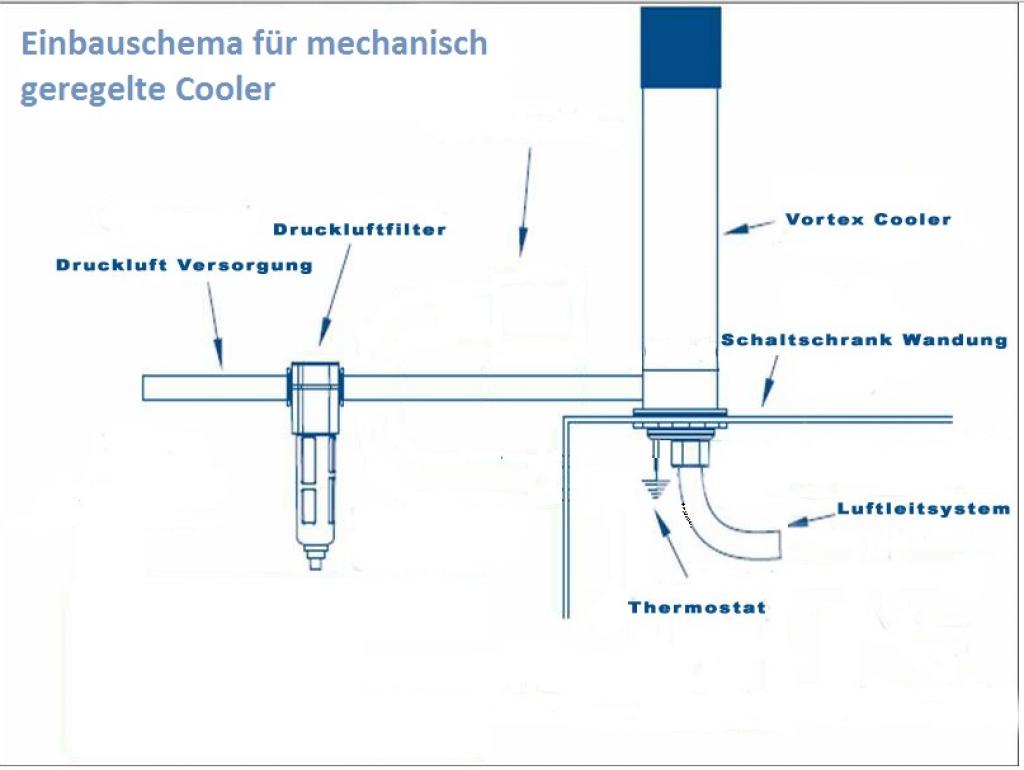 Diese Vortex Cooler werden mit einem empfindlichen elektrischen Thermostat (+/- 1°C Regelintervall) und Magnetventil für die Druckluftleitung geregelt, womit eine genaue Temperaturregelung innerhalb des Schaltschrankes möglich ist und die Druckluft-Zufuhr nur bei Erfordernis freigegeben wird. Der Thermostat ist ab Werk auf 32°C eingestellt, kann aber auch manuell auf die gewünschte Zieltemperatur justiert werden.
