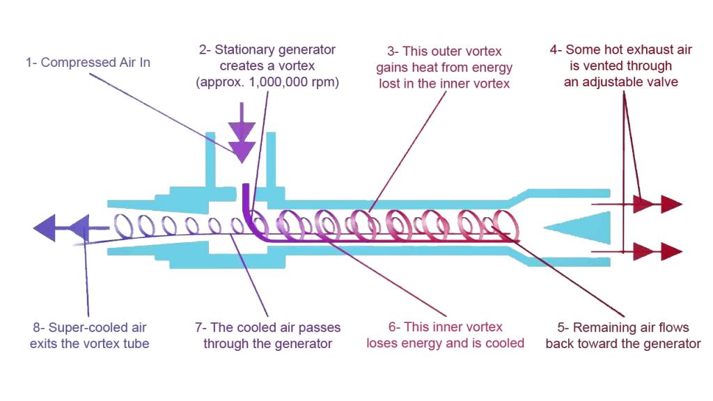 Das Wirbelrohr wurde 1930 von dem französischen Physiker Georges Ranque entdeckt. Vortec entwickelte auf der Basis des Wirbelrohrprinzips praxisreife, wirksame Kühlungsanwendungen für Industrie und Technik. Flüssigkeit, die sich um eine Achse dreht - wie ein Tornado - wird als "Wirbel" bezeichnet. Ein Wirbelrohr erzeugt einen Wirbel aus Druckluft und trennt ihn in zwei Ströme: Einen Heiß- und einen Kaltluftstrom. Die Druckluft tritt in einen zylindrischen Generator ein, der proportional größer ist als das (lange) heiße Rohr, wo sie die dort befindliche Luft in Drehung versetzt. Danach wird die kreisende Luft an der Innenwandung des heißen Rohrs entlang gepresst, wo sie Geschwindigkeiten von 1 000 000 U/min erreicht. Am Ende des heißen Rohrs entweicht ein kleiner Teil der Luft durch ein Nadelventil am Heißluftaustritt. Die übrige Luft wird zwangsweise mit niedrigerer Geschwindigkeit durch die Mitte des eintretenden Luftstroms zurückgeführt. Die Wärme in der langsamer strömenden Luft wird an die schneller strömende eintretende Luft abgegeben. Die unterkühlte Luft strömt durch die Mitte des Generators zum Kaltluftaustritt.