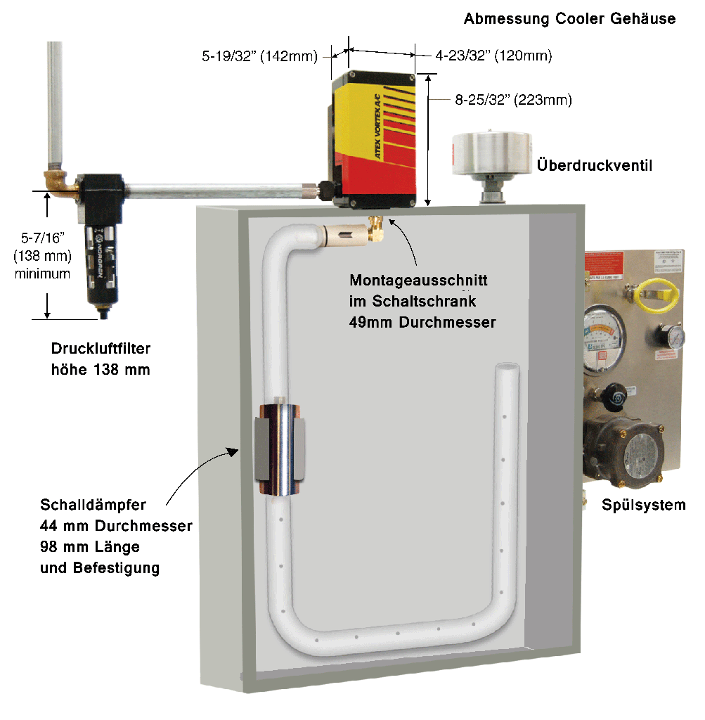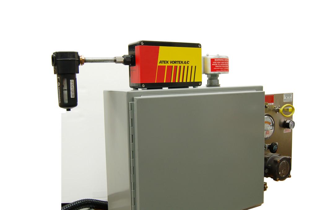 Der ATEX Vortex A/C wurde entwickelt um Industrieschaltschränke in den Ex Zonen 2 und 22 an gefährlichen Standorten, zu kühlen. Dabei nutzt er ausschließlich gefilterte und getrocknete Druckluft zum Erzeugen der Kühlung. Der ATEX Vortex A/C ist nur in Verbindung mit einem ausreichend dimensionierten Überdruckventil und Spülsystem zu verwenden, die in der Lage sind, die durch den ATEX Vortex A/C zusätzlich eingeführte Luft zu ventilieren. (Die dafür notwendigen Produkte können auf Anfrage von uns geliefert werden).
