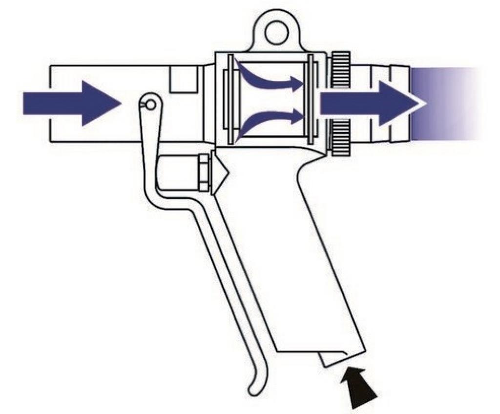 Der im Hand-E-Vac integrierte Luftstromverstärker nutzt das Luftstromverstärker Prinzip um mit geringen Anteilen Druckluft hoher Geschwindigkeit eine um das 7-fache Menge Umgebungsluft mitzureißen. Bei Betätigung des Pistolengriffs fließt Druckluft in eine mit diversen Bohrungen versehene Kammer und strömt in eine vorbestimmte Richtung, dabei wird die freie Umgebungsluft mitgerissen und steht zum verstärkten Abblasen zur Verfügung. Auf der Gegenseite wird dadurch eine starke Saugwirkung erzeugt. Dieses Vakuum kann dann in diversen Anwendungen genutzt werden. Die Saug- bzw. Blasrichtung ist durch einfaches Drehen des Generators zu ändern.