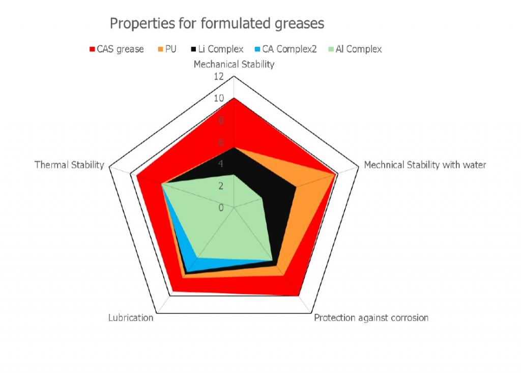 Des Weiteren kann der Fettverbrauch im Vergleich zu herkömmlichen Fetten um bis zu 30% verringert werden. Dies wird erreicht durch ein hervorragendes Wasserabscheidevermögen, erhöhtes Lasttragevermögen und Hochtemperaturstabilität des Fettes.