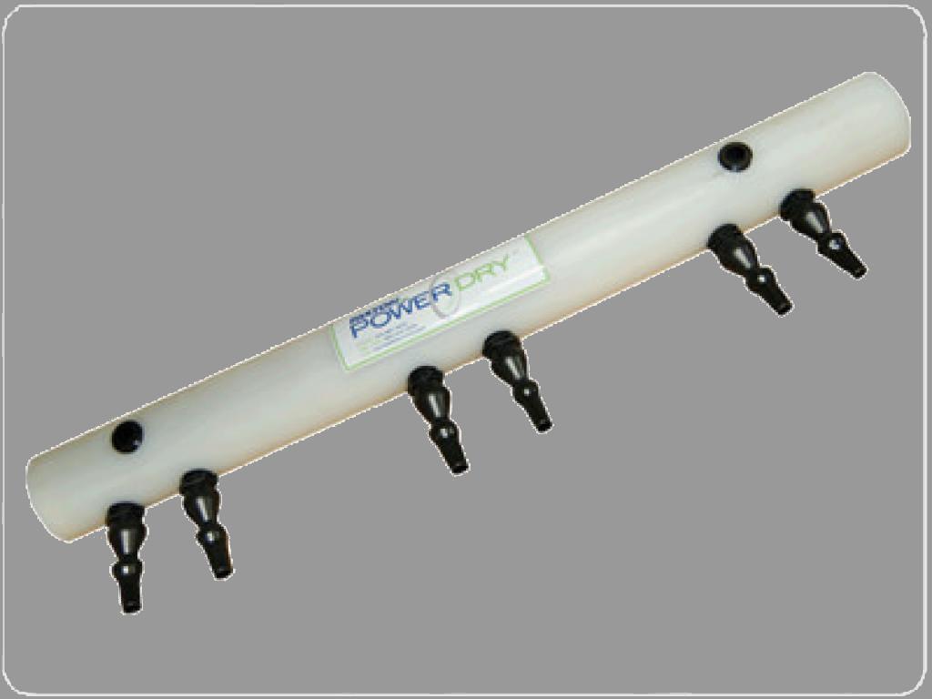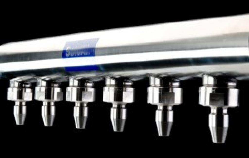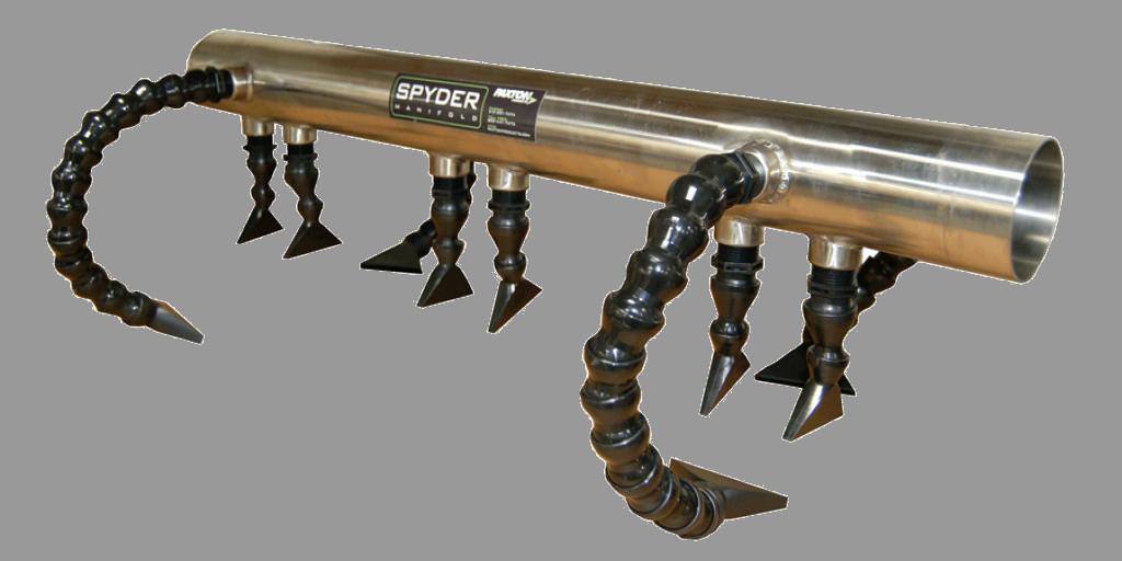 Spyder-Düsen werden eingesetzt zum Trocknen und Abblasen an Flaschenhälsen, Kronkorken, Verschlüssen und Deckeln. Dadurch wird Korrosion und Keimbildung verhindert. Verfügbar in Polypropylen oder Edelstahl, mit diversen flexiblen Abgängen die Einstellbarkeit auf jeden Flaschen oder Behältertyp ermöglichen. Anschlussdurchmesser 76 mm.